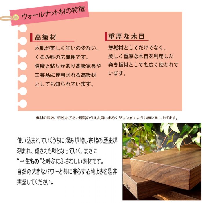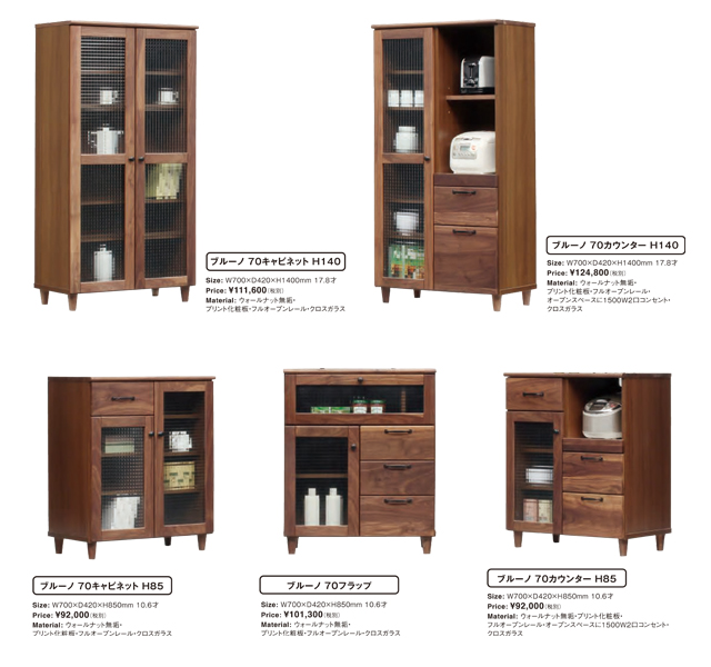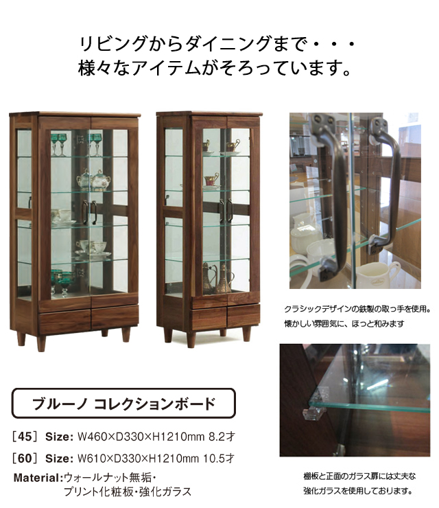 | 材質 | 天板・前板:ウォールナット無垢材(PU塗装仕上げ) 側面・内側:プリント化粧板 取手:スチール製 正面扉・棚板:強化ガラス |