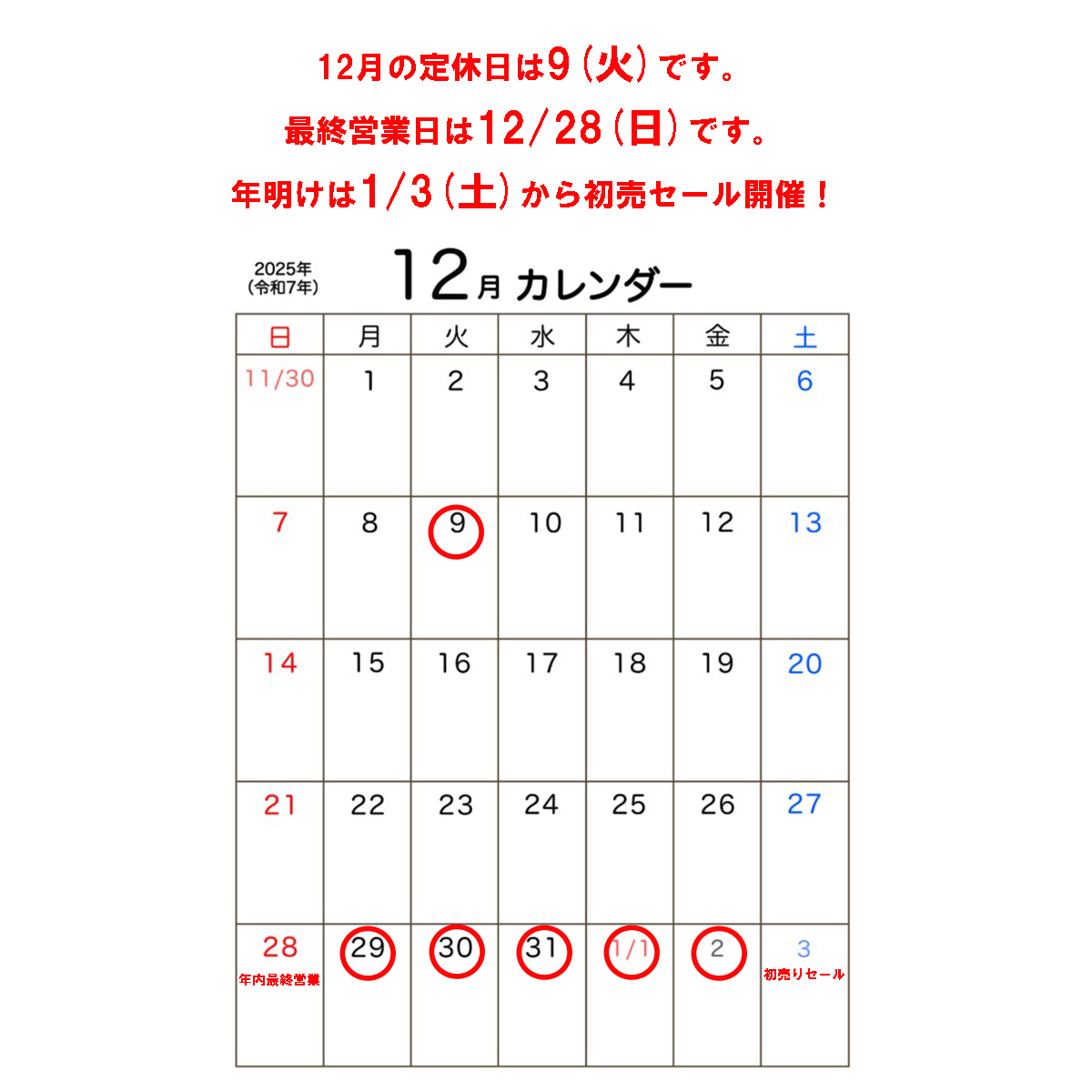 年内最終営業日は12/28(日)、年明けは1/3(土)より初売りセール開催します。