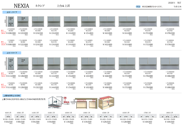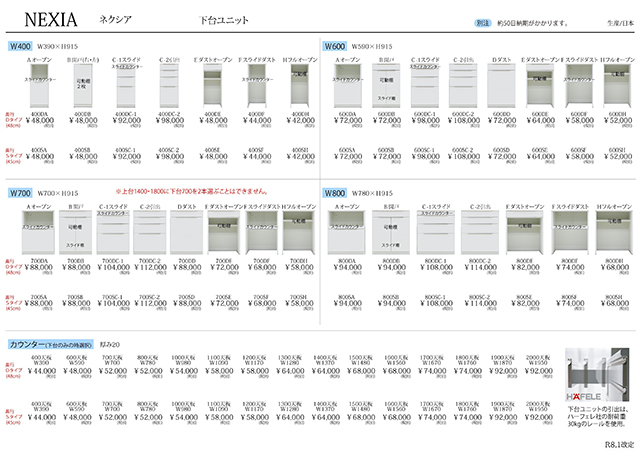 本体ボディカラー・カウンターカラー・高さ・奥行・下台仕様・引出し前板カラーの