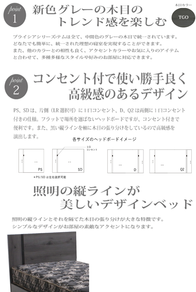 プライシアシリーズのベッドは、おしゃれでトレンドな中間色のグレーの木目カラー。
