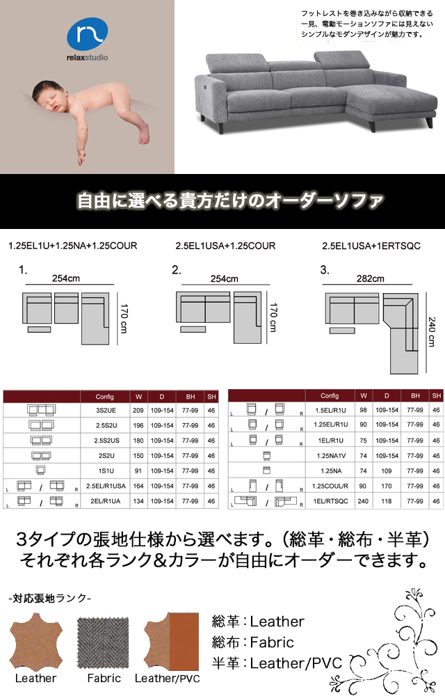 | 色 | 総革(各ランク有)/ファブリック(各ランク有)/レザー(各ランク有) オーダー対応 |